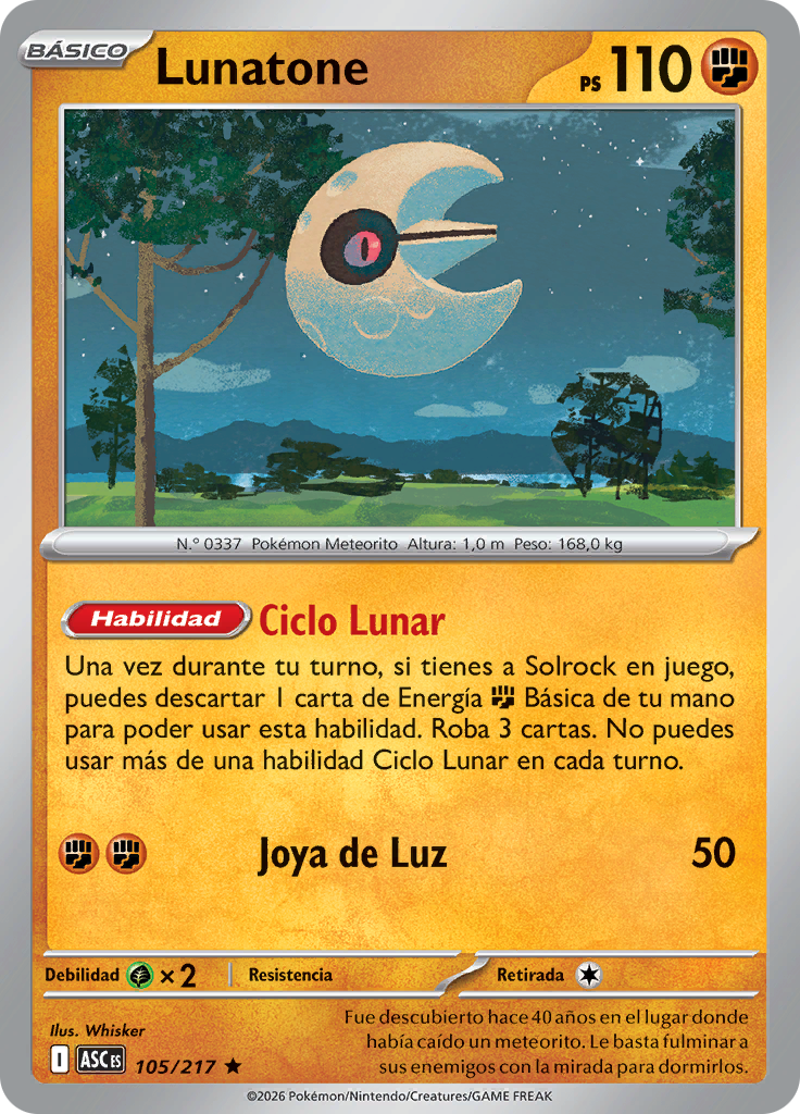Una vez durante tu turno, si tienes a Solrock en juego, puedes descartar 1 carta de Energía [F] Básica de tu mano para poder usar esta habilidad. Roba 3 cartas. No puedes usar más de una habilidad Ciclo Lunar en cada turno.