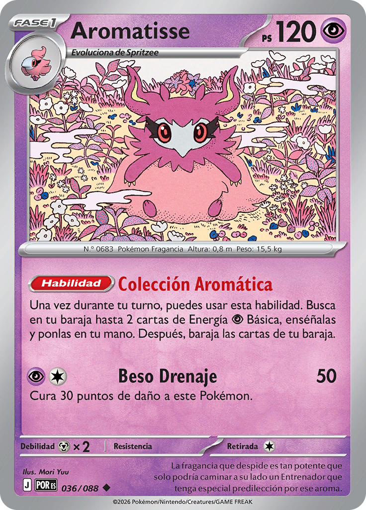 Una vez durante tu turno, puedes usar esta habilidad. Busca en tu baraja hasta 2 cartas de Energía [P] Básica, enséñalas y ponlas en tu mano. Después, baraja las cartas de tu baraja.