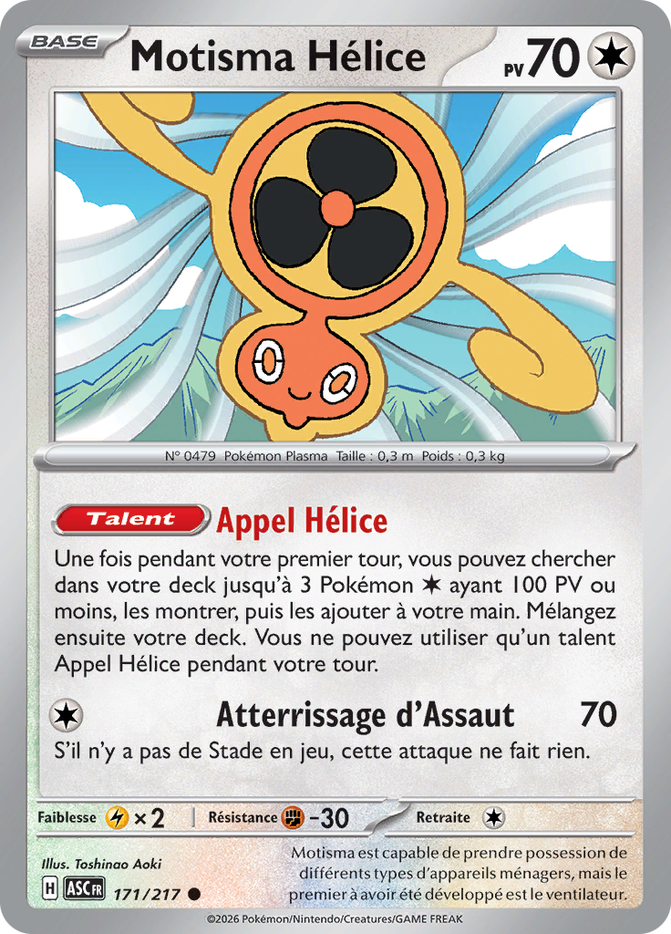 Une fois pendant votre premier tour, vous pouvez chercher dans votre deck jusqu'à 3 Pokémon [C] ayant 100 PV ou moins, les montrer, puis les ajouter à votre main. Mélangez ensuite votre deck. Vous ne pouvez utiliser qu'un talent Appel Hélice pendant votre tour.