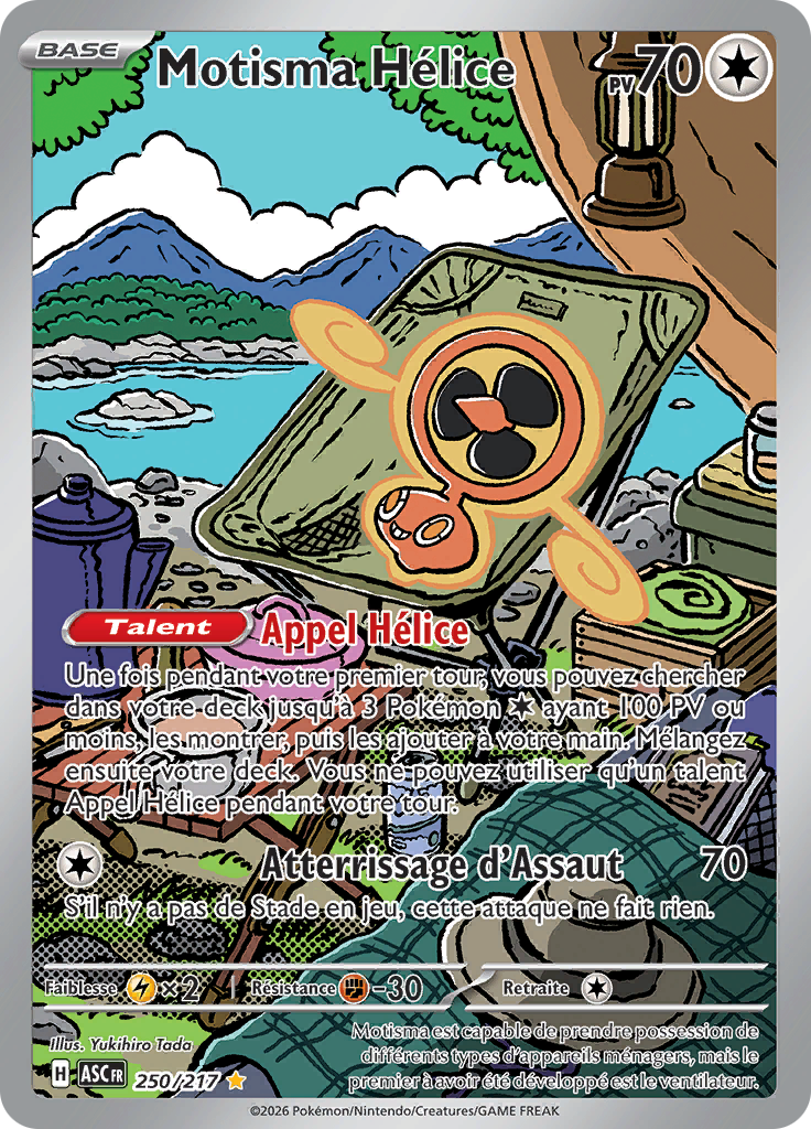 Une fois pendant votre premier tour, vous pouvez chercher dans votre deck jusqu'à 3 Pokémon [C] ayant 100 PV ou moins, les montrer, puis les ajouter à votre main. Mélangez ensuite votre deck. Vous ne pouvez utiliser qu'un talent Appel Hélice pendant votre tour.