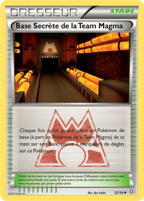 Chaque fois qu'un joueur place un Pokémon de base (à part les Pokémon de la Team Magma) de sa main sur son Banc, placez 2 marqueurs de dégâts sur ce Pokémon.