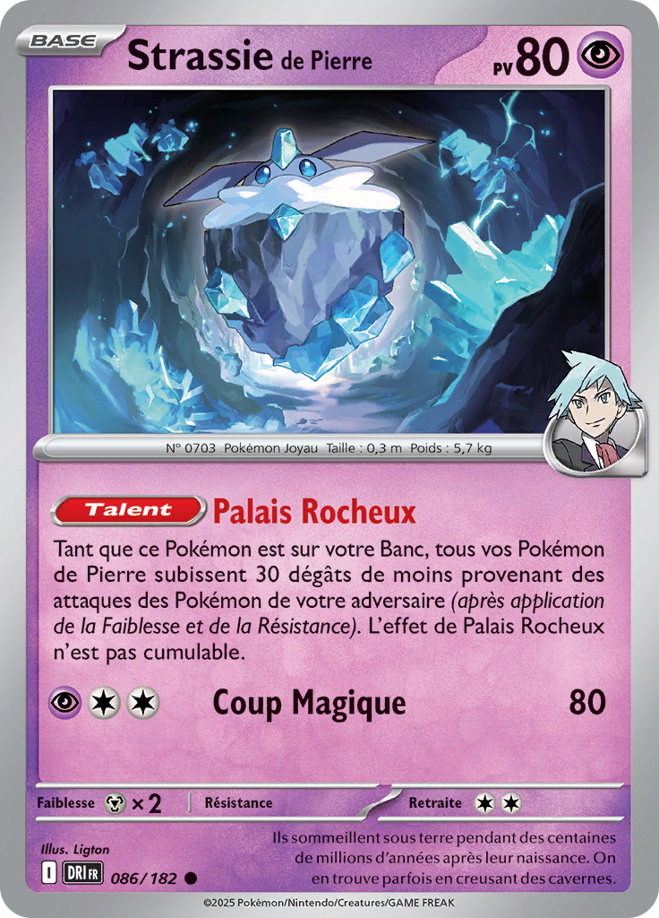 Tant que ce Pokémon est sur votre Banc, tous vos Pokémon de Pierre subissent 30 dégâts de moins provenant des attaques des Pokémon de votre adversaire (après application de la Faiblesse et de la Résistance). L'effet de Palais Rocheux n'est pas cumulable.