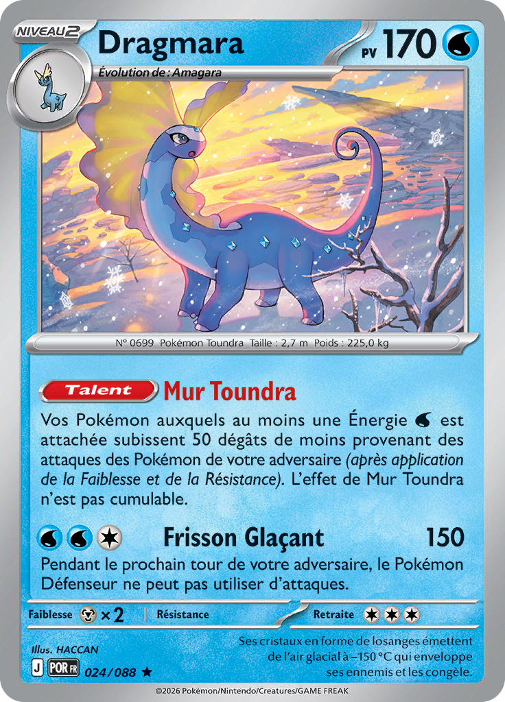 Vos Pokémon auxquels au moins une Énergie [W] est attachée subissent 50 dégâts de moins provenant des attaques des Pokémon de votre adversaire (après application de la Faiblesse et de la Résistance). L'effet de Mur Toundra n'est pas cumulable.
