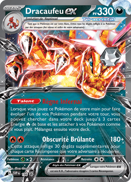 Lorsque vous jouez ce Pokémon de votre main pour faire évoluer l'un de vos Pokémon pendant votre tour, vous pouvez chercher dans votre deck jusqu'à 3 cartes Énergie [R] de base et les attacher à vos Pokémon comme il vous plaît. Mélangez ensuite votre deck.
