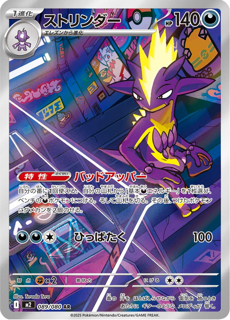 自分の番に1回使える。自分の山札から「基本[D]エネルギー」を1枚選び、ベンチの[D]ポケモンにつける。そして山札を切る。その後、つけたポケモンにダメカンを2個のせる。