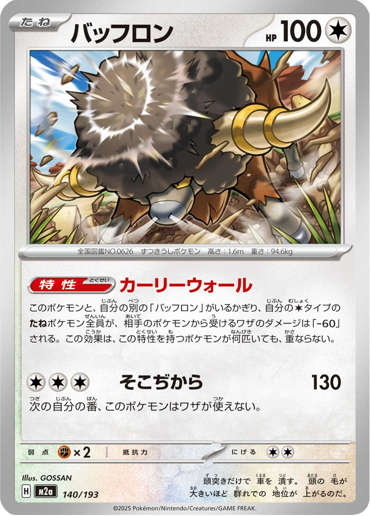 If you have any other Bouffalant in play, each of your Basic [C] Pokémon take 60 less damage from your opponent's attacks (after applying Weakness and Resistance). You can't apply more than 1 Curly Wall Ability at a time.