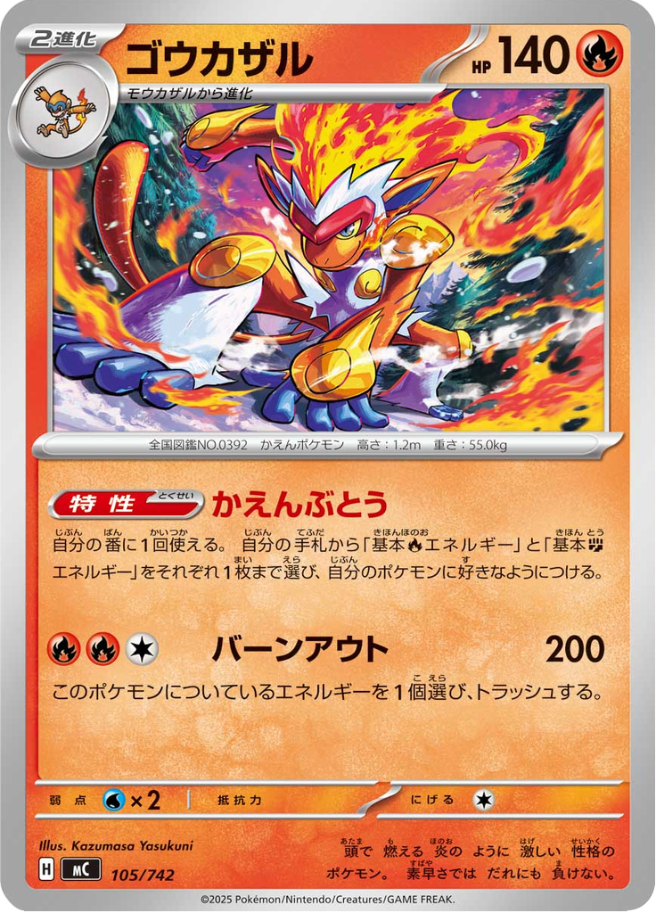 自分の番に1回使える。自分の手札から「基本[R]エネルギー」と「基本[F]エネルギー」をそれぞれ1枚まで選び、自分のポケモンに好きなようにつける。