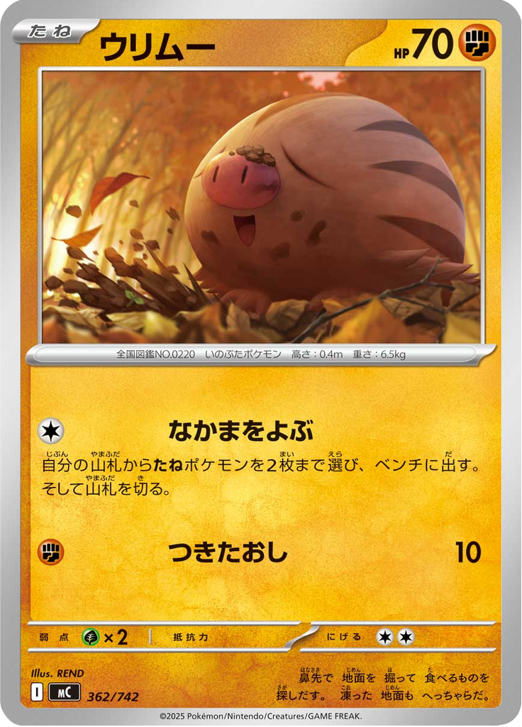 自分の山札からたねポケモンを2枚まで選び、ベンチに出す。そして山札を切る。