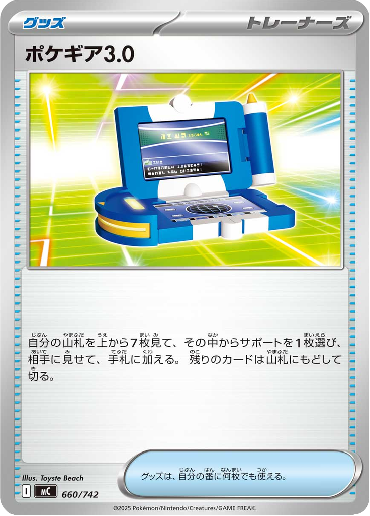 自分の山札を上から7枚見る。その中にあるサポートを1枚、相手に見せてから、手札に加えてよい。残りのカードは山札にもどして切る。