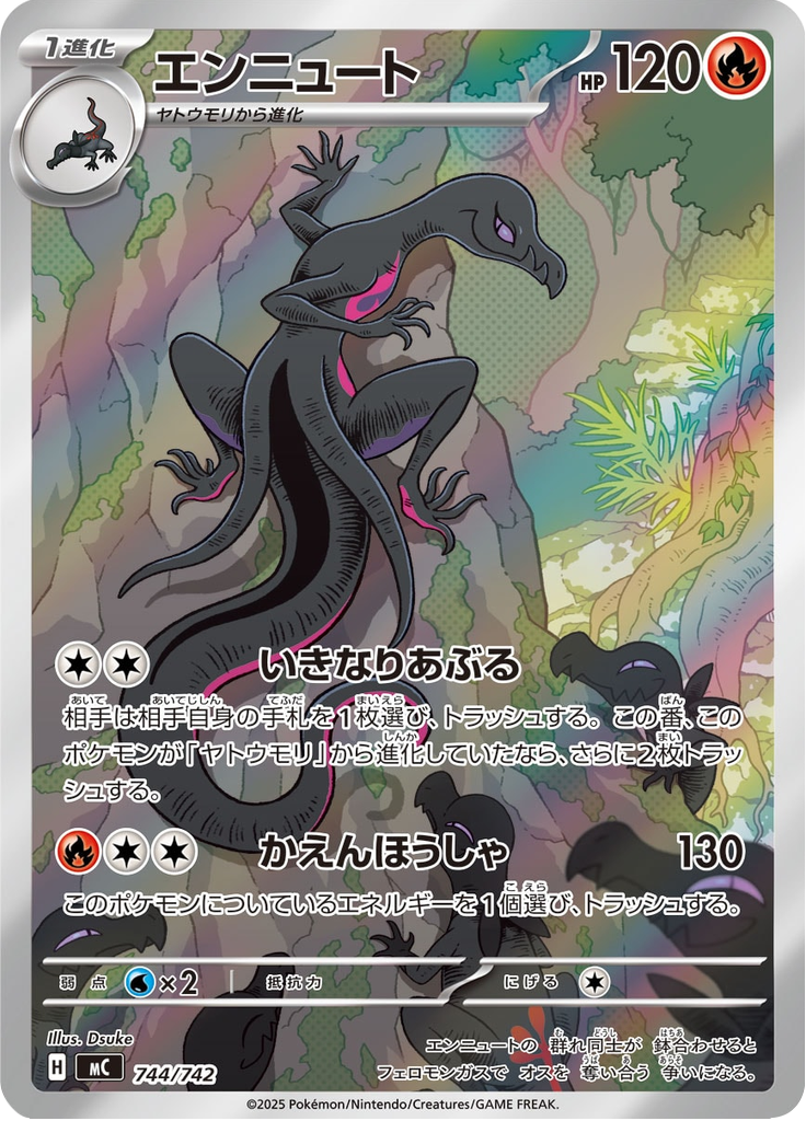 相手は相手自身の手札を1枚選び、トラッシュする。この番、このポケモンが「ヤトウモリ」から進化していたなら、さらに2枚トラッシュする。