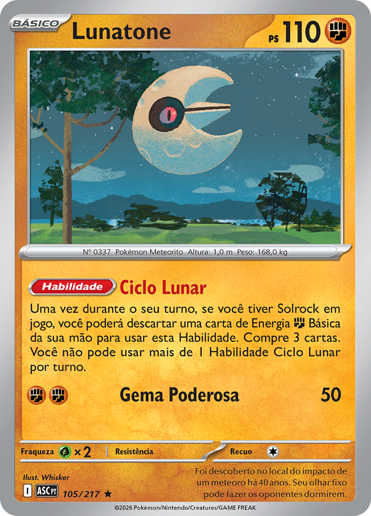 Uma vez durante o seu turno, se você tiver Solrock em jogo, você poderá descartar uma carta de Energia [F] Básica da sua mão para usar esta Habilidade. Compre 3 cartas. Você não pode usar mais de 1 Habilidade Ciclo Lunar por turno.
