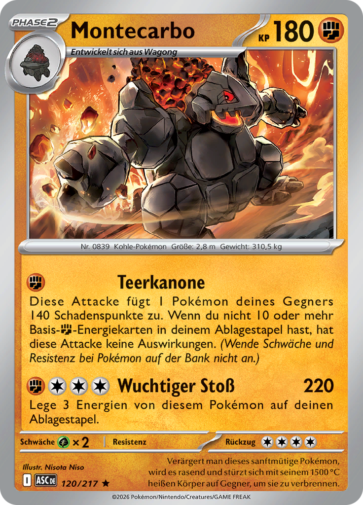 Diese Attacke fügt 1 Pokémon deines Gegners 140 Schadenspunkte zu. Wenn du nicht 10 oder mehr Basis-[F]-Energiekarten in deinem Ablagestapel hast, hat diese Attacke keine Auswirkungen. (Wende Schwäche und Resistenz bei Pokémon auf der Bank nicht an.)