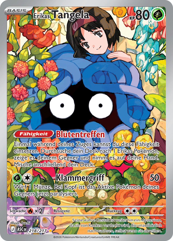 Einmal während deines Zuges kannst du diese Fähigkeit einsetzen. Durchsuche dein Deck nach 1 Erikas Pokémon, zeige es deinem Gegner und nimm es auf deine Hand. Mische anschließend dein Deck.