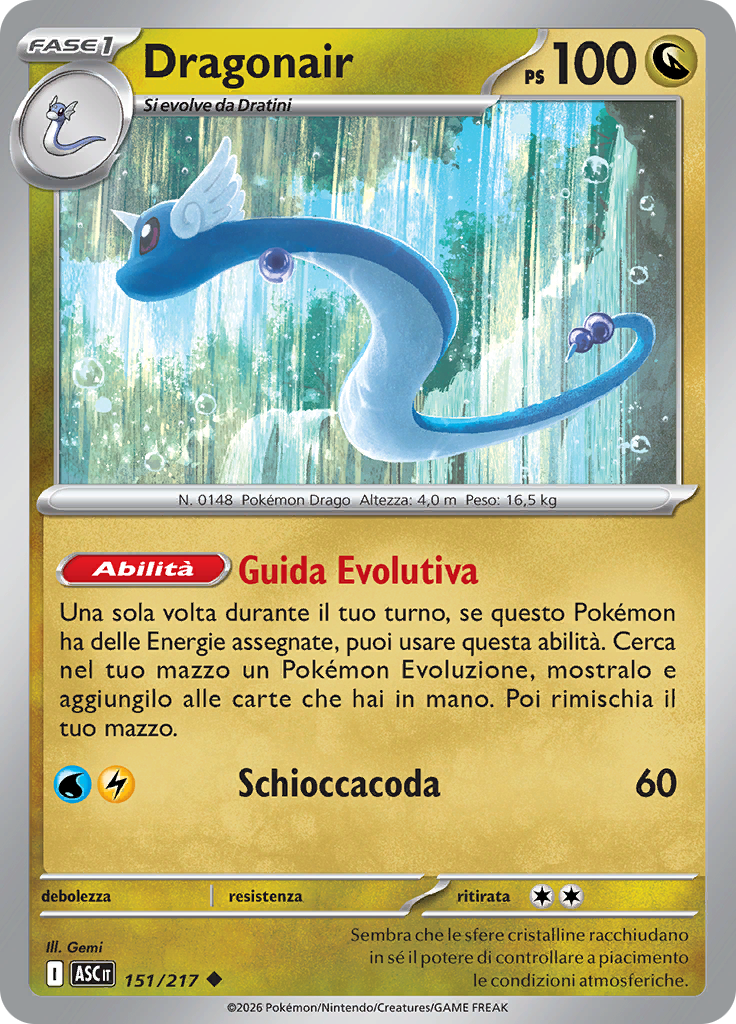 Una sola volta durante il tuo turno, se questo Pokémon ha delle Energie assegnate, puoi usare questa abilità. Cerca nel tuo mazzo un Pokémon Evoluzione, mostralo e aggiungilo alle carte che hai in mano. Poi rimischia il tuo mazzo.