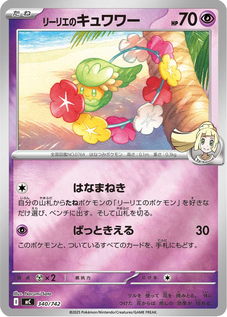 自分の山札からたねポケモンの「リーリエのポケモン」を好きなだけ選び、ベンチに出す。そして山札を切る。