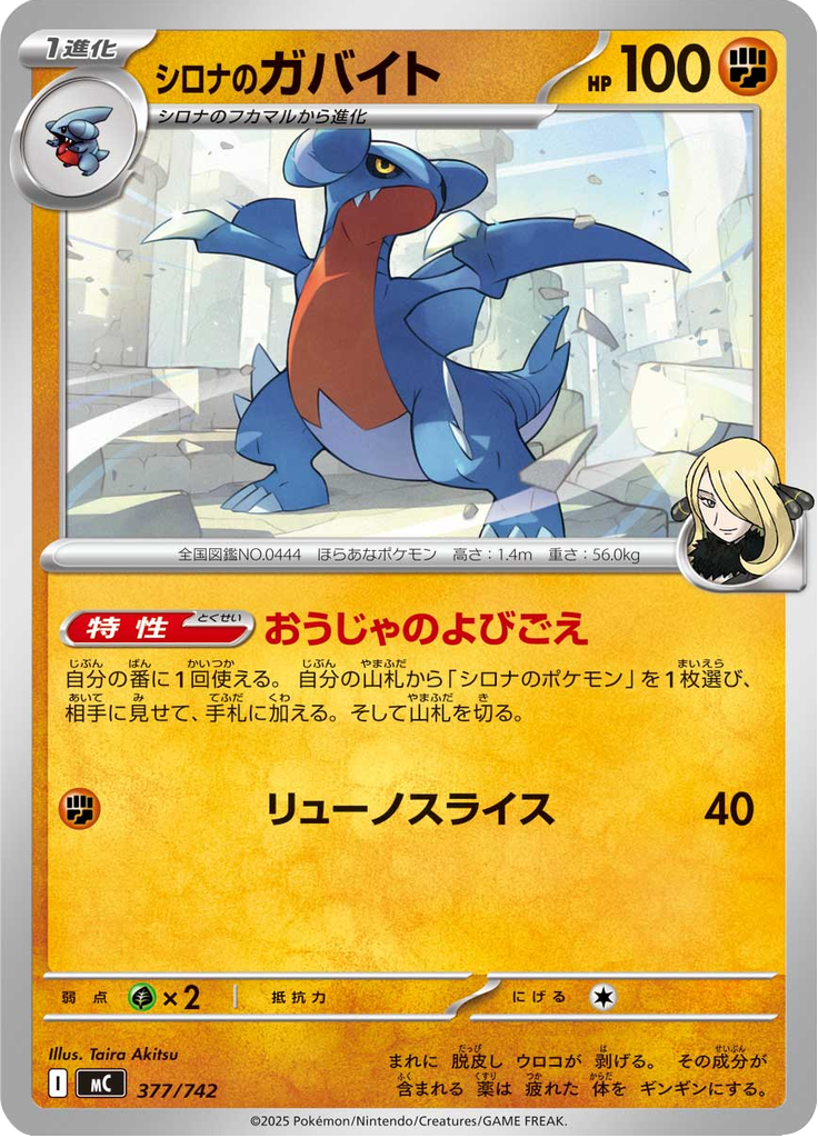 自分の番に1回使える。自分の山札から「シロナのポケモン」を1枚選び、相手に見せて、手札に加える。そして山札を切る。