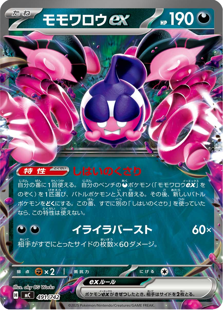 自分の番に1回使える。自分のベンチの[D]ポケモン(「モモワロウex」をのぞく)を1匹選び、バトルポケモンと入れ替える。その後、新しいバトルポケモンをどくにする。この番、すでに別の「しはいのくさり」を使っていたなら、この特性は使えない。