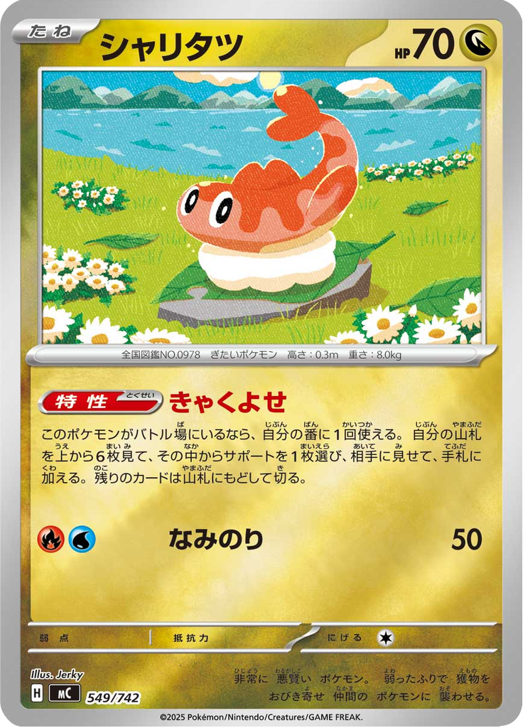 このポケモンがバトル場にいるなら、自分の番に1回使える。自分の山札を上から6枚見て、その中からサポートを1枚選び、相手に見せて、手札に加える。残りのカードは山札にもどして切る。