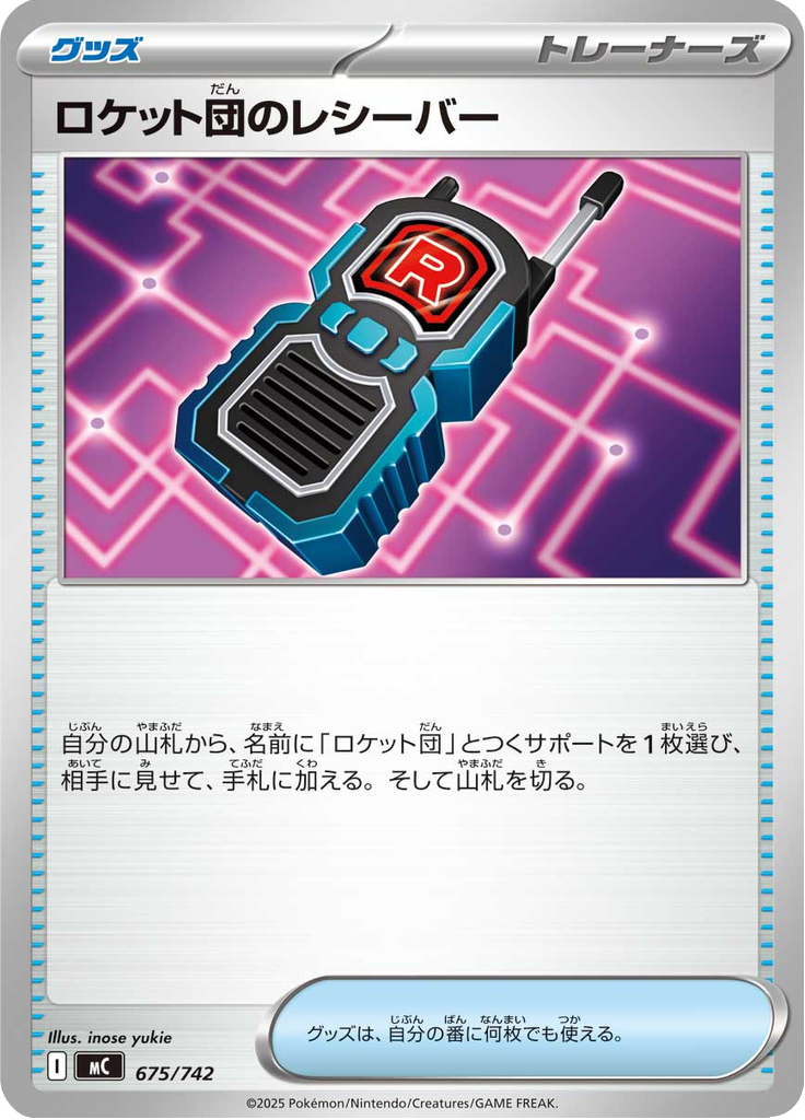 自分の山札から、名前に「ロケット団」とつくサポートを1枚選び、相手に見せて、手札に加える。そして山札を切る。