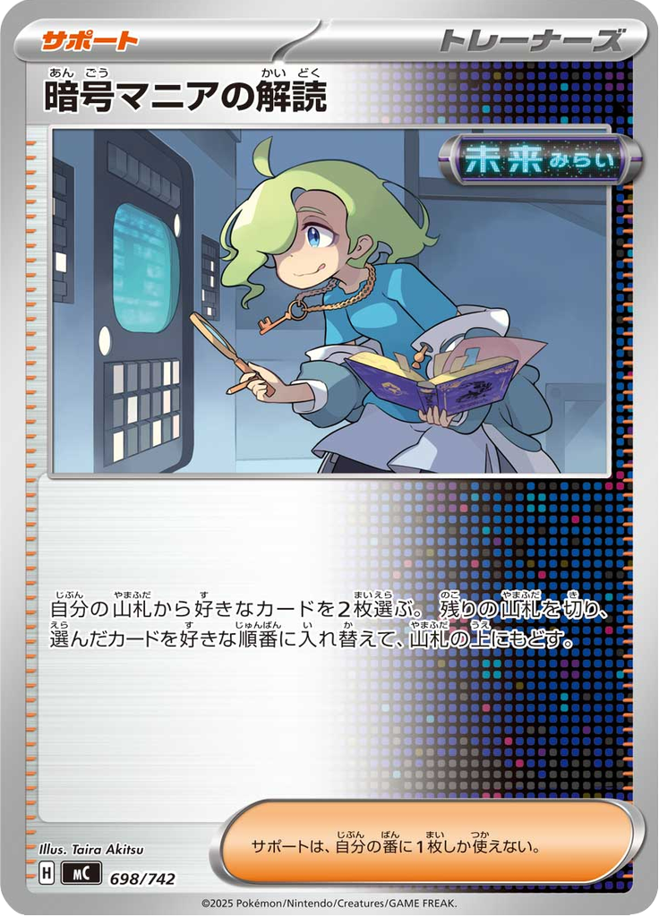 自分の山札から好きなカードを2枚選ぶ。残りの山札を切り、選んだカードを好きな順番に入れ替えて、山札の上にもどす。