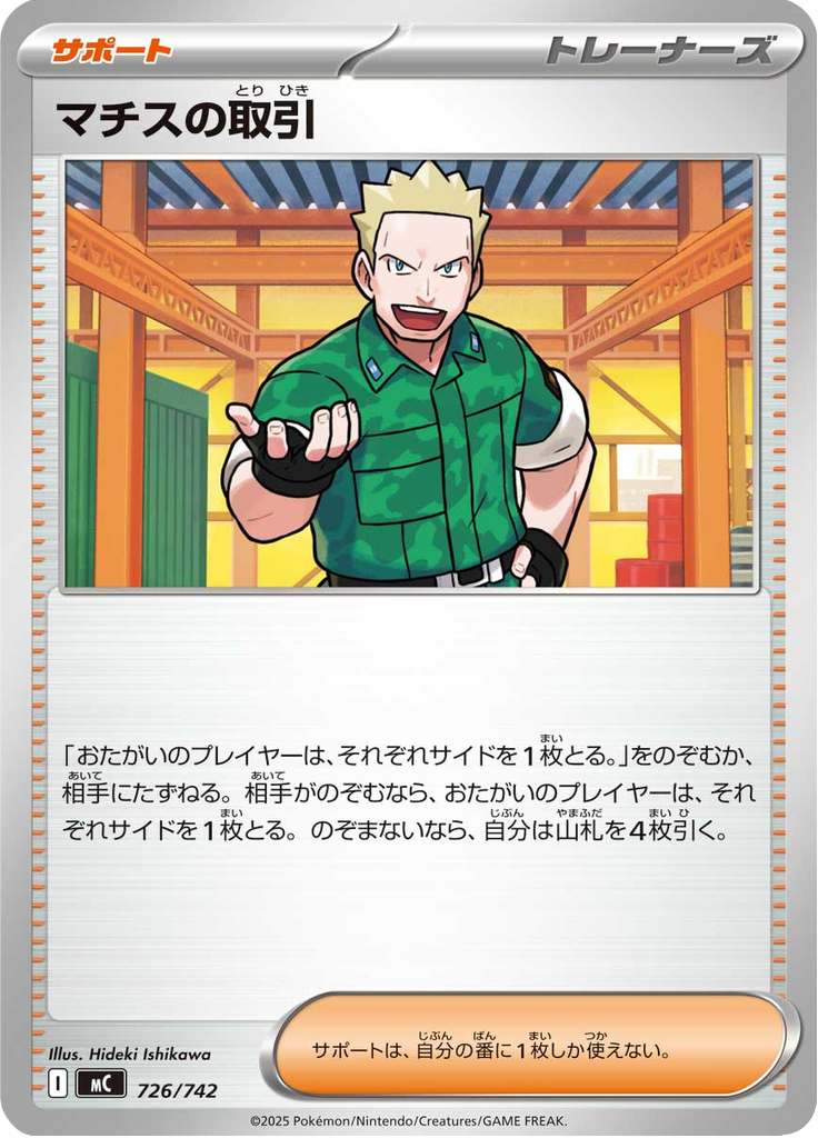 「おたがいのプレイヤーは、それぞれサイドを1枚とる。」をのぞむか、相手にたずねる。相手がのぞむなら、おたがいのプレイヤーは、それぞれサイドを1枚とる。のぞまないなら、自分は山札を4枚引く。